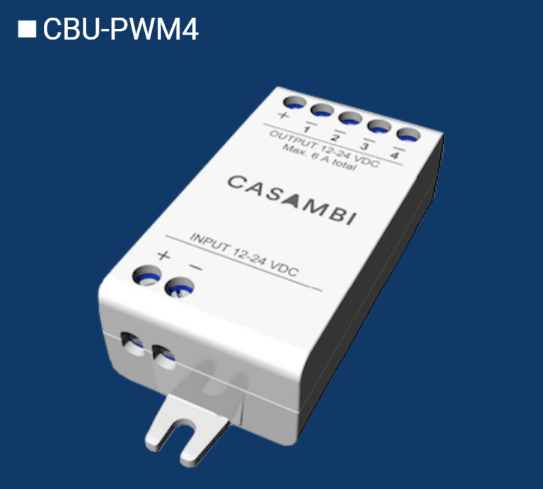 CBU-PWM4は、LEDストリップや定電圧LEDモジュールなどの定電圧LED負荷のための4チャンネルPWM調光器です。