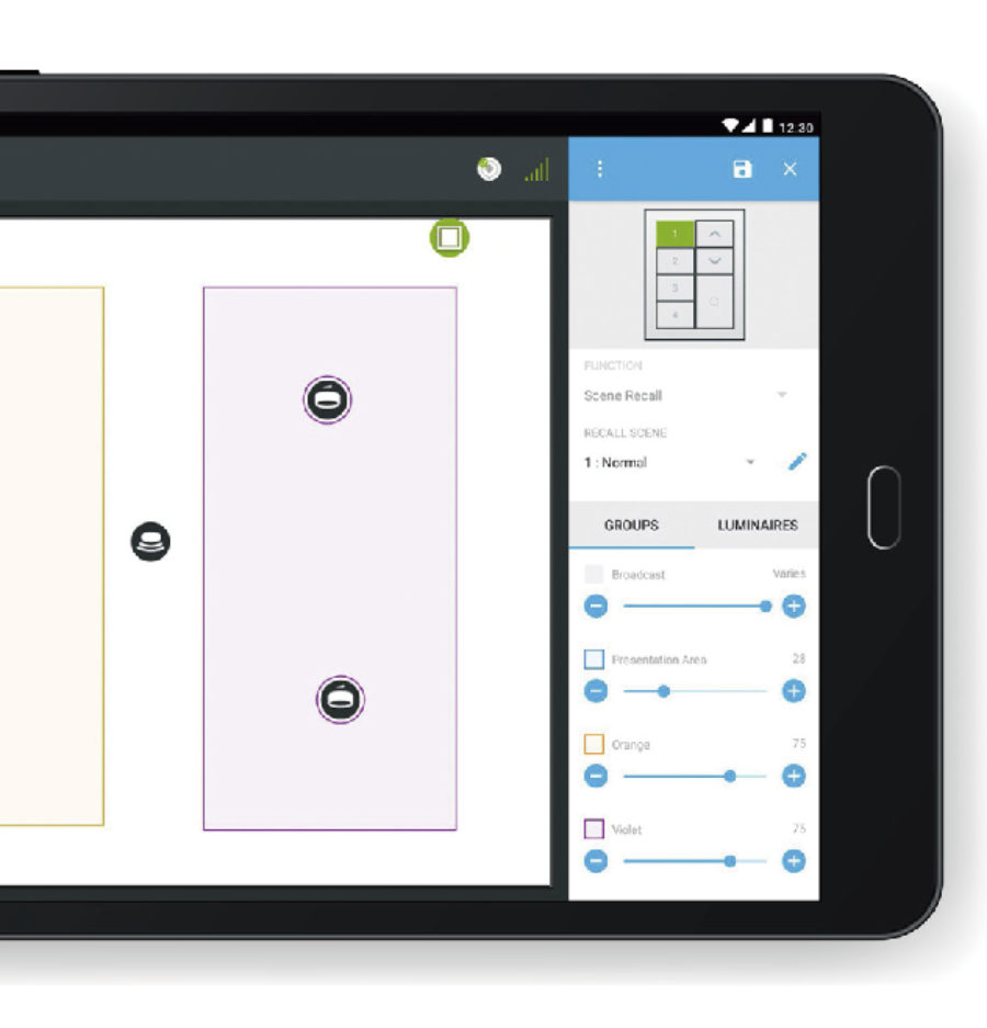 この直感的なアプリを使用して、RoomSetはすべてのDALIコンポーネント(スイッチ、センサー、DALI照明器具)を自動的に見つけます。実際にはRoomSetの照明ソリューションはBluetooth経由で設定を行い、各331マルチセンサーに保存されたデータを使用するため、ノートパソコンを接続する必要はありません。