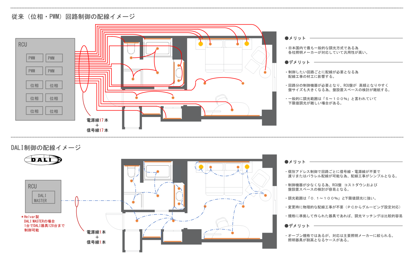 客室の照明制御には、個別制御ができ、配線工事がシンプルなDALIが最適です